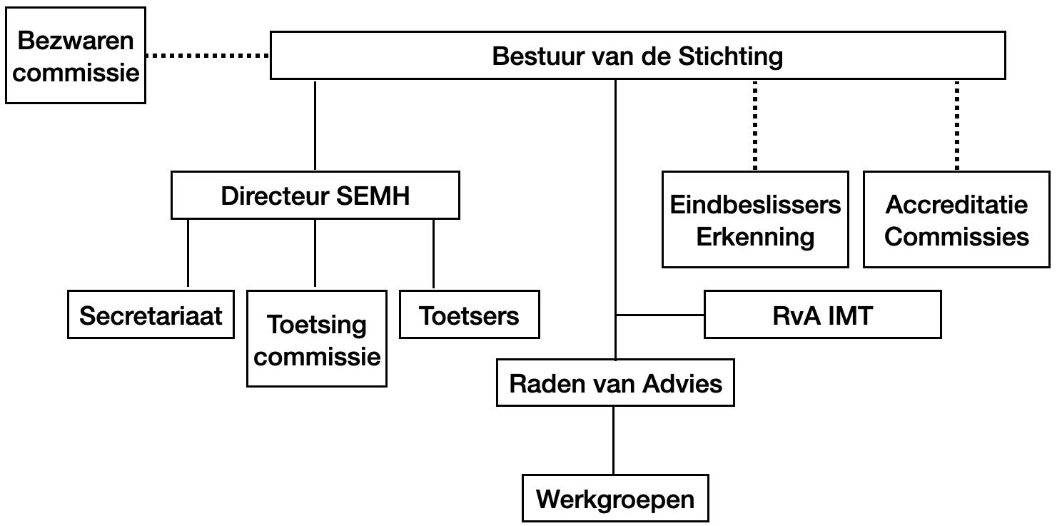De SEMH beschikt over een aantal Raden van Advies die, ondersteund door werkgroepen, de eisen ontwikkelen. Daarnaast is er een Toetsingscommissie. De Toetsingscommissie zorgt er voor dat de kwaliteit van de toetsingen gewaarborgd is en de werkwijze / interpretatie van de eisen door alle toetsers gelijk is.